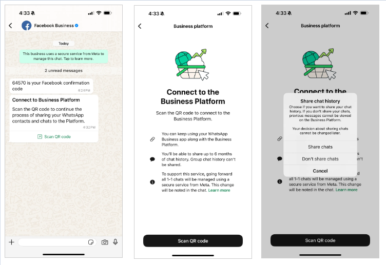 The WhatsApp message instructs the business to use the app to scan the QR code displayed in Embedded Signup. Tapping the button in the message informs the business that they will be given the option to share their WhatsApp Business app messaging history with you, Tapping the Scan QR code button in the app then gives the business the option to share their chat history with you.