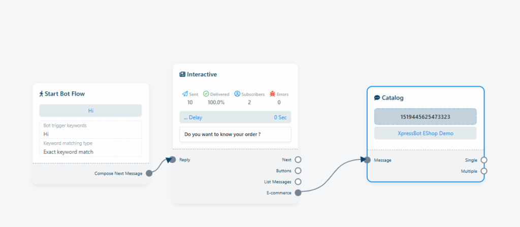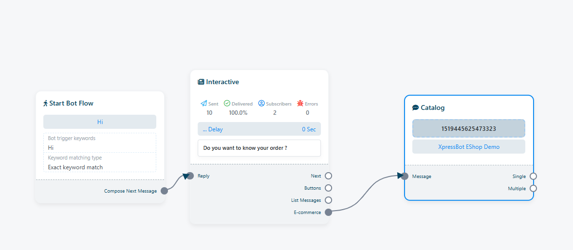 Whenever a user types a message with keywords that match the trigger set for this Chatbot, BotSailor will automatically send a message containing the catalog products.