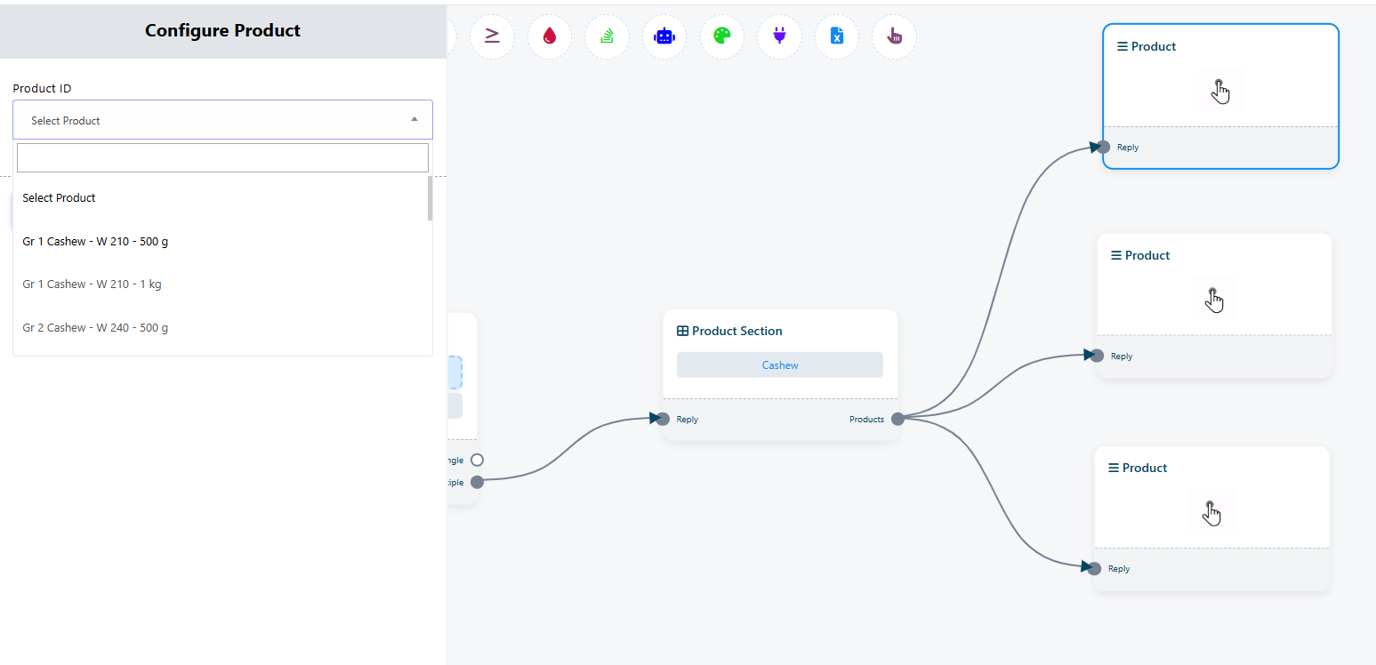 The catalog element has two options for adding products. We can use single products or multiple products. Let’s drag a connector from the multiple socket and leave the cursor. You will get a product section with three products in it. You can add more products to it or remove any if you want.