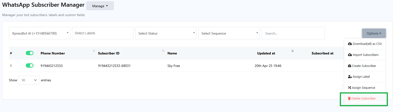 • To delete subscribers, select subscribers and click on the `Delete Subscriber` option.