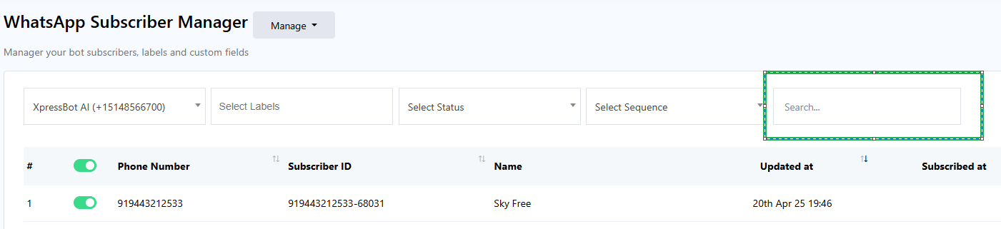 On the Subscriber Manager page, you can search for subscribers using the search bar and different options.