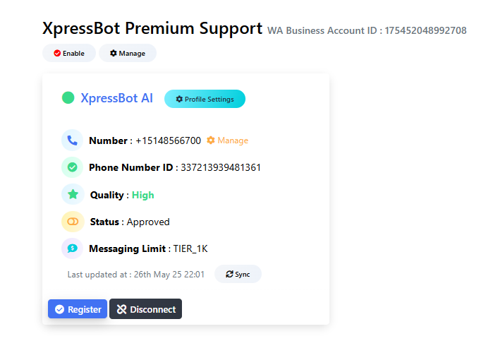 If your account appears like the below the image , you will not be able to send or receive messages. This typically happens when your subscription has not been renewed within the grace period, and you have not re-subscribed after expiry. As a result, webhook connectivity is automatically disabled by the system to prevent further processing.