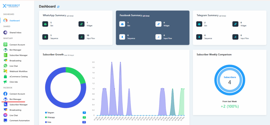 - From your Xpressbot dashboard, click on “Facebook Bot Manager” to begin configuring your bot settings.