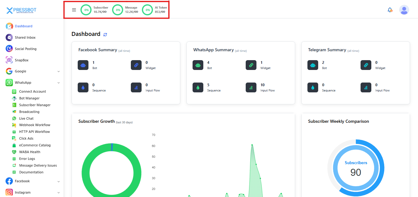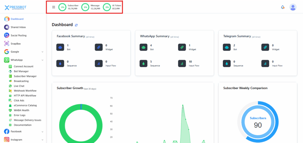 Keeping track of your usage in XpressBot is essential to manage your message credits and AI tokens effectively. Whether you’re running campaigns on WhatsApp, Telegram, or Facebook Messenger, monitoring usage helps avoid disruptions and improves performance.